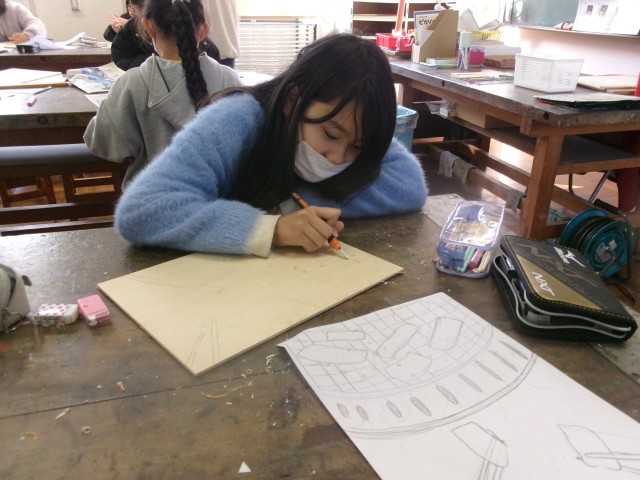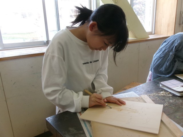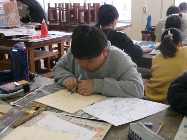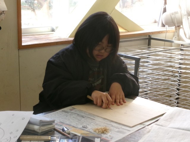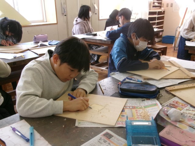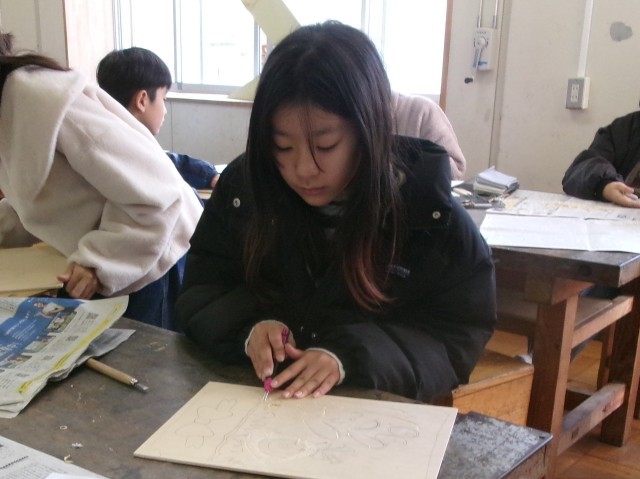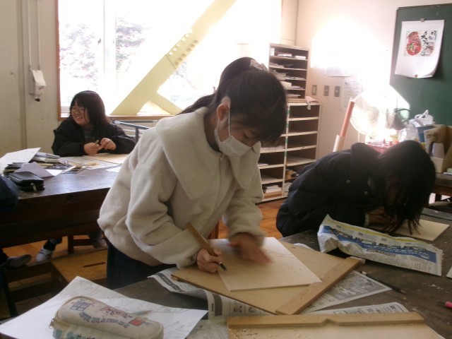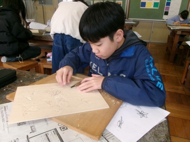 5年1組の図工の授業の様子です。多色刷り版画を行っています。集中して彫り進めています。早い子は刷りに入りました。