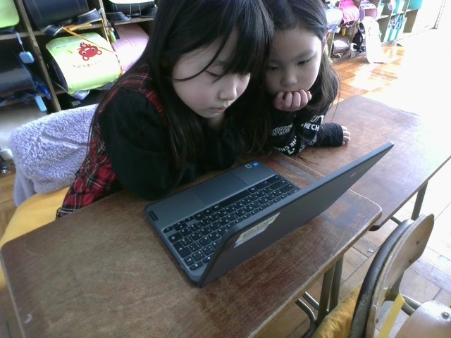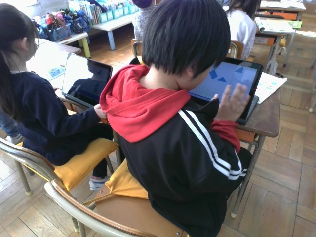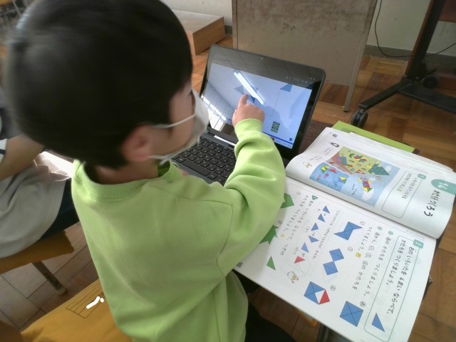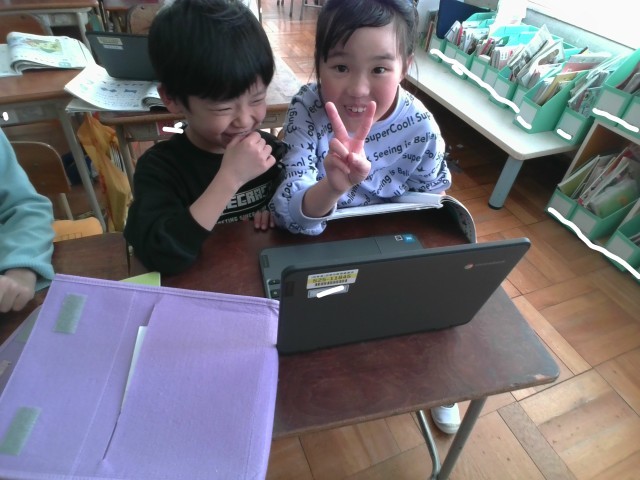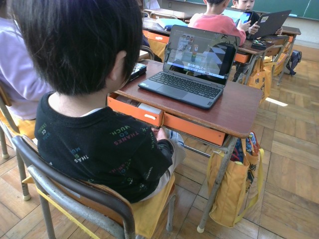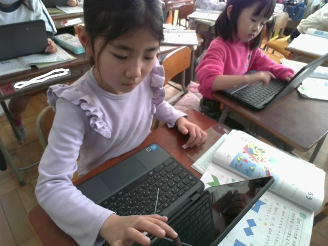5時間目、1組は算数で、2組は生活科でクロムブックを使いました。図形を動かしたり、自分が調べたいことを入力して検索したり、もうすっかり慣れて使いこなしています。