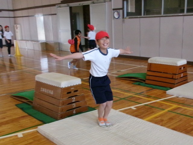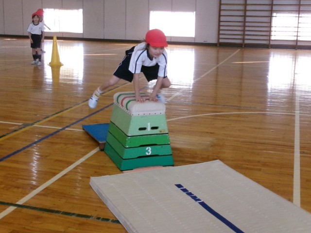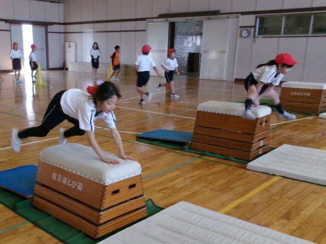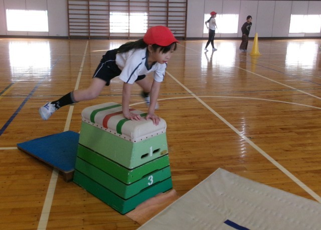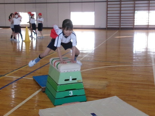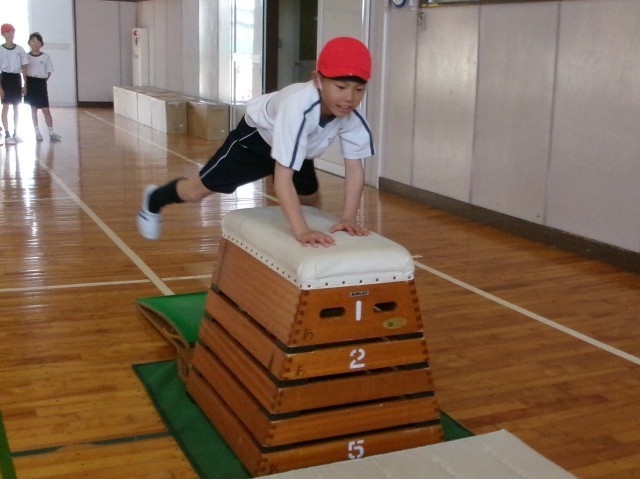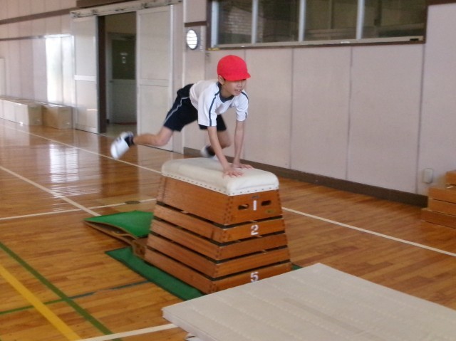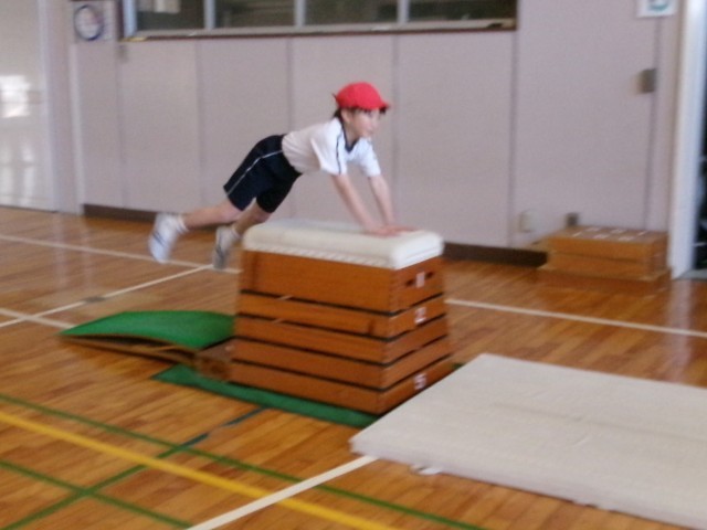 3年2組の体育の授業の様子です。開脚跳びに挑戦しています。