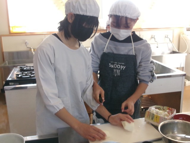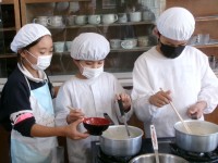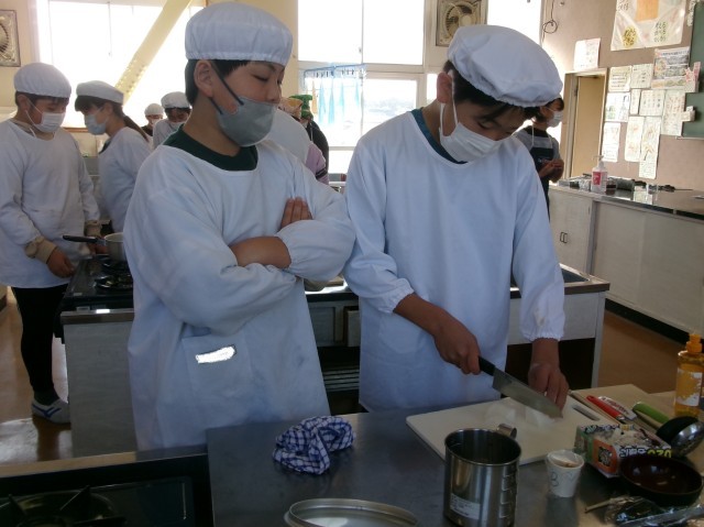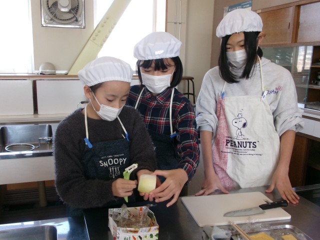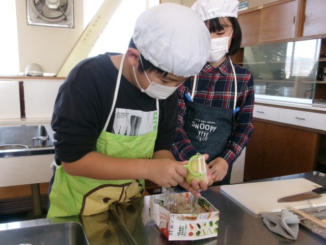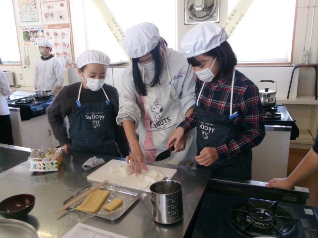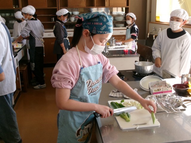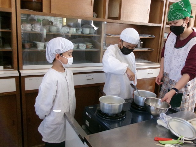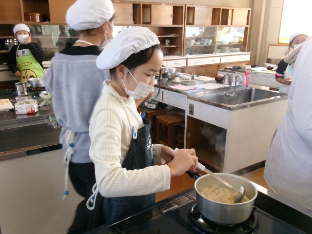 5年2組の家庭科「調理実習」授業の様子です。お味噌汁を作っています。