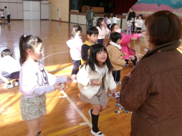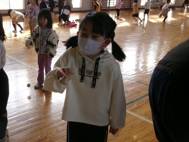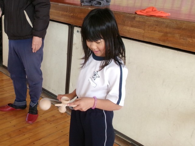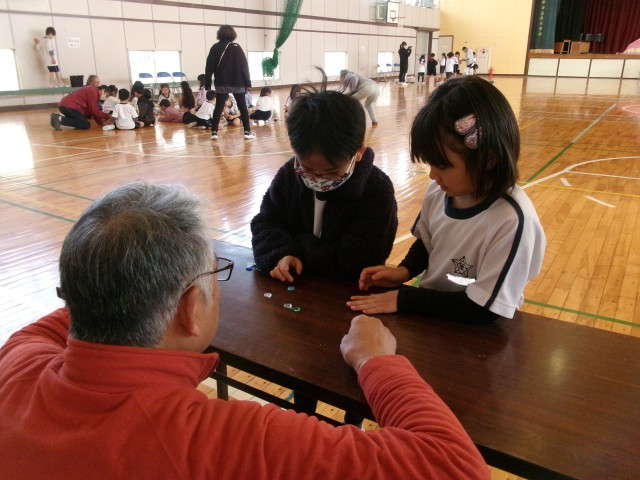 1年生と2年生が地域の皆様から昔の遊びを教えてもらっています。子どもたちは、けん玉、こま回し、おはじき、はねつき、だるまおとし、お手玉を体験しました。