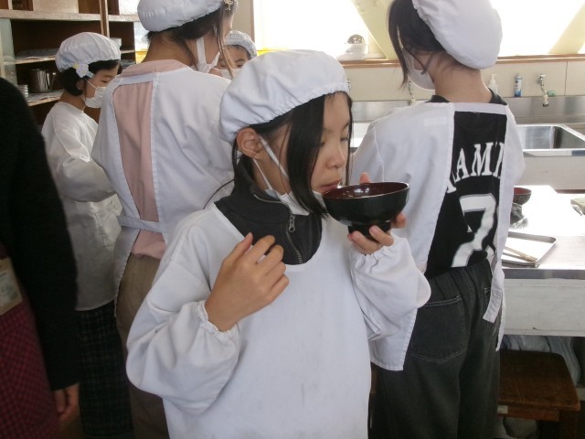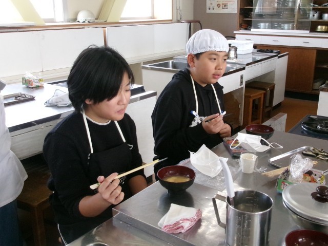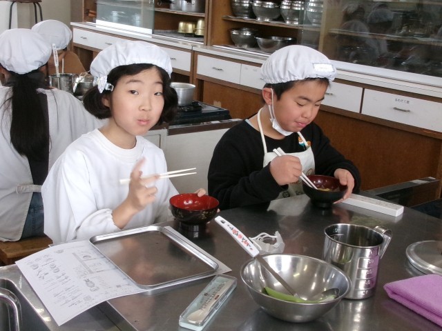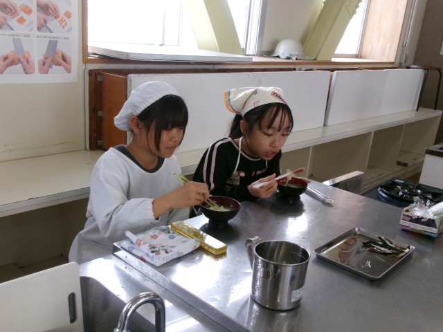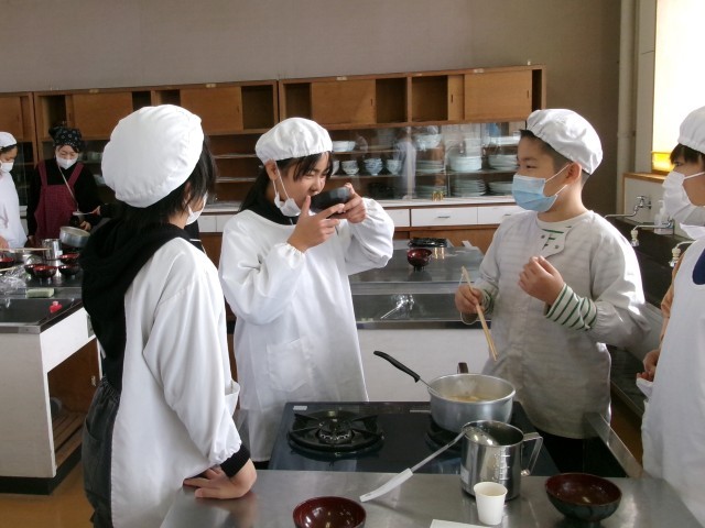 5年3組の家庭科「調理実習」授業の様子です。お味噌汁を作っています。