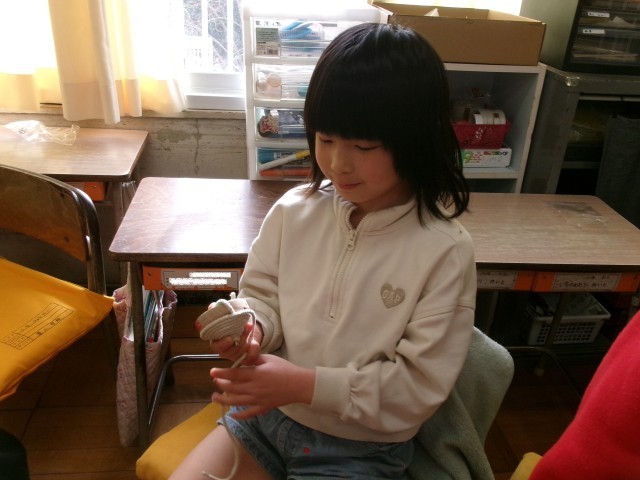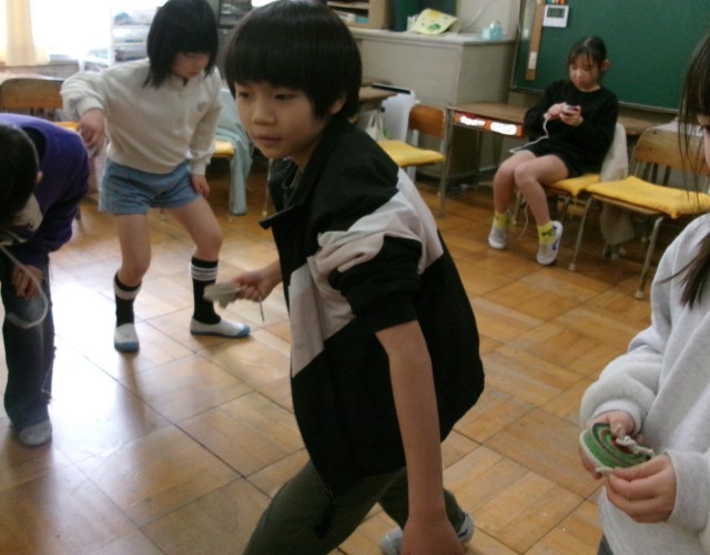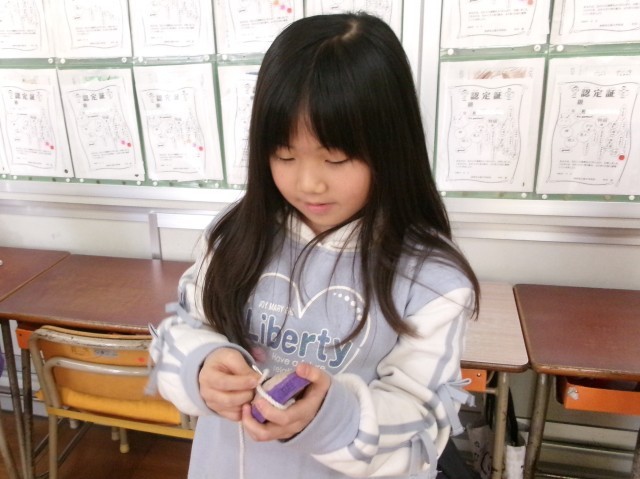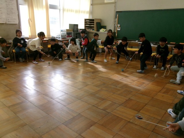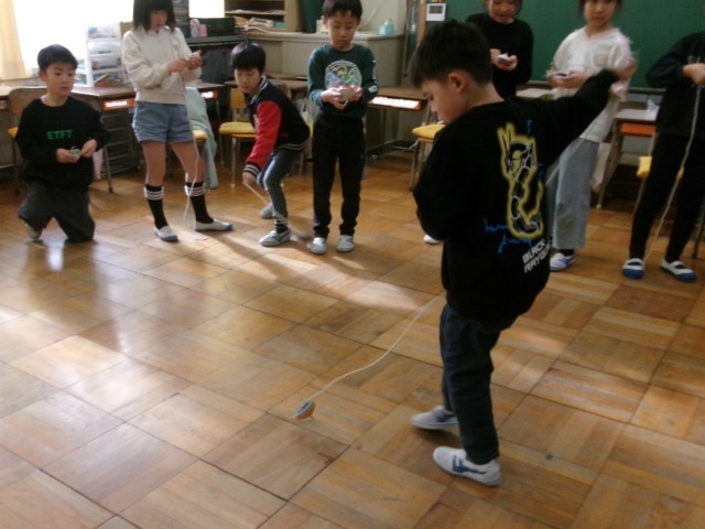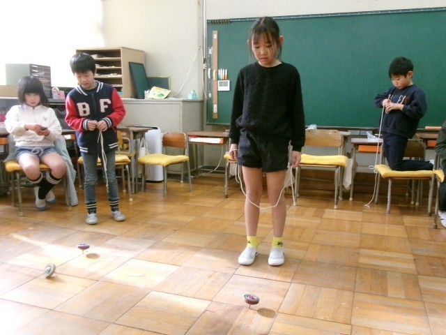 2年1組の生活科の授業の様子です。昨日教わったこま回しに挑戦しています。