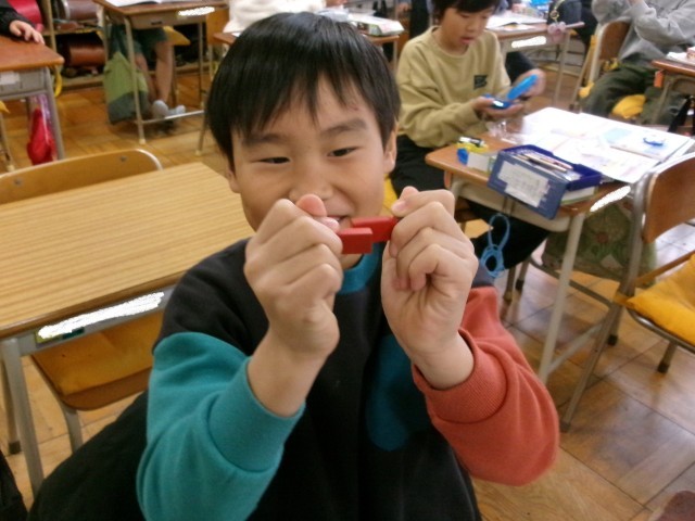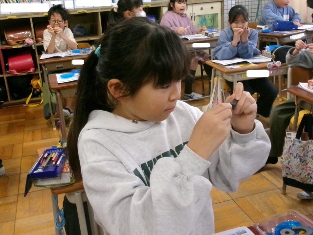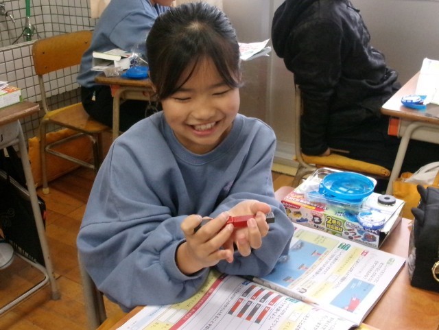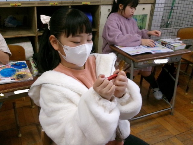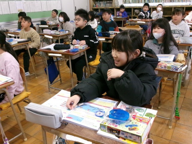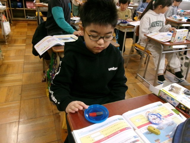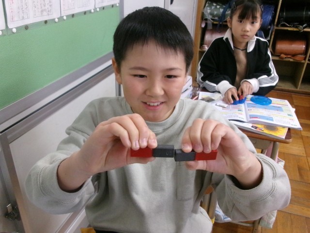 3年2組の理科の授業の様子です。磁石にはN極とS極があることを知りました。同じ極同士が反発し合ったり、違う極同士が引きつけ合ったりすることを見つけました。