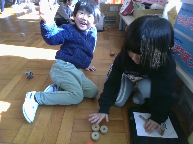 1年生は、先日地域の方に昔の遊びのこま、けん玉などを教えていただきました。今日はその時のことを思い出しながらみんなで挑戦してみました。地域の方のように上手にやるのは難しいですが、練習してできたときの喜びが大きいようです。