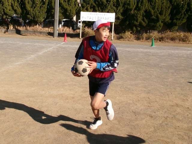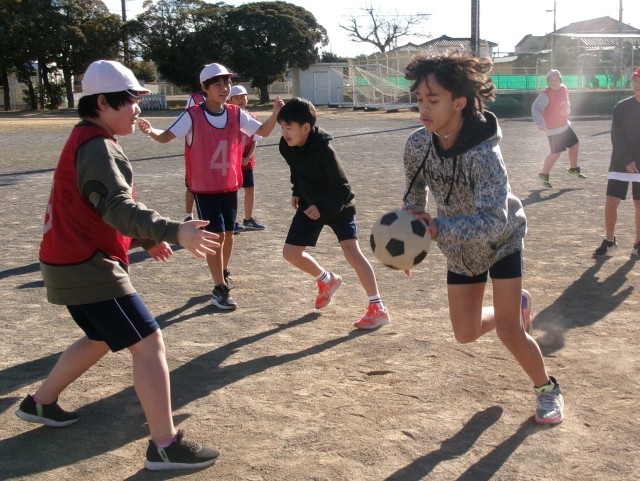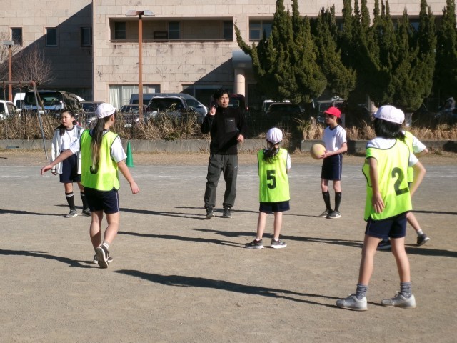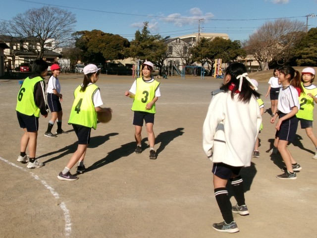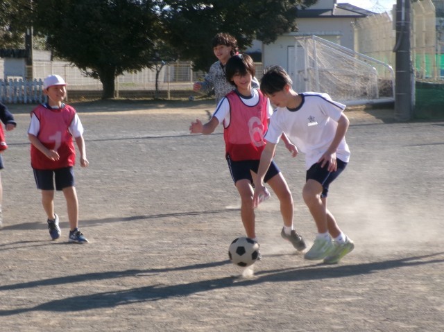 6年3組の体育の授業の様子です。サッカーの授業です。導入では、サッカーですがボールをバスケットボールのようにドリブルするなど手を使って回し、ボールを持っていない子の動きを考えています。