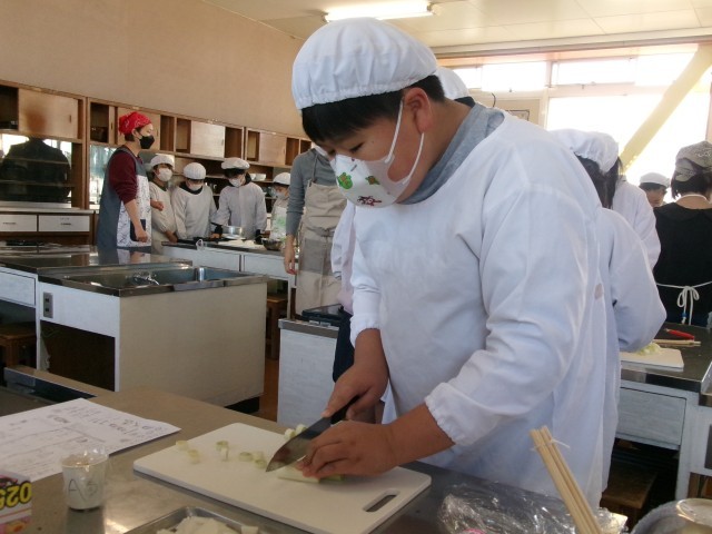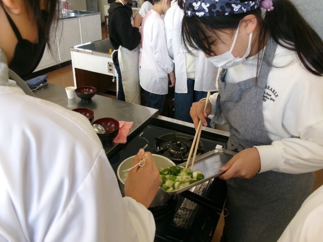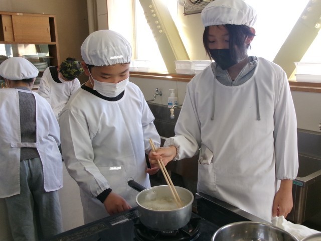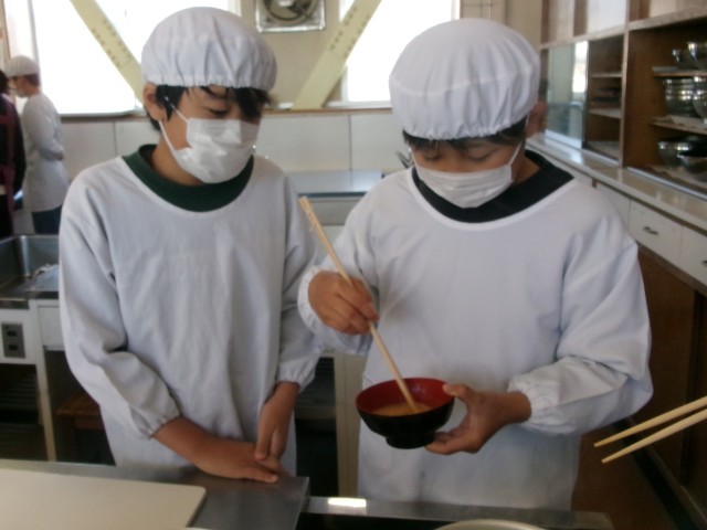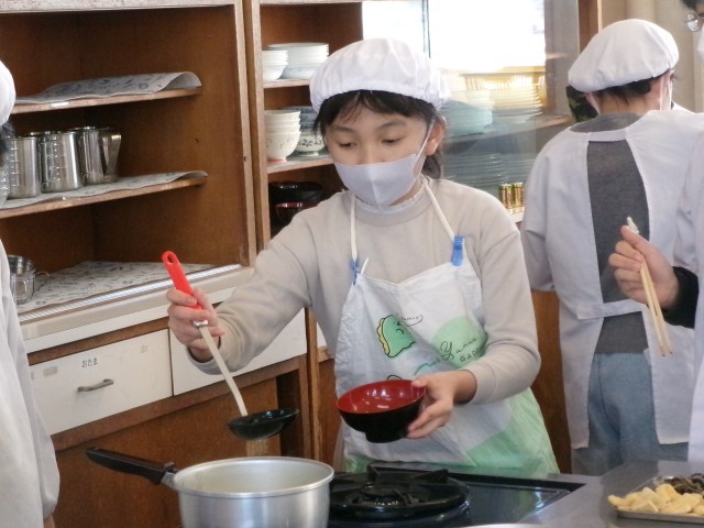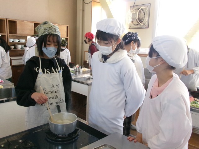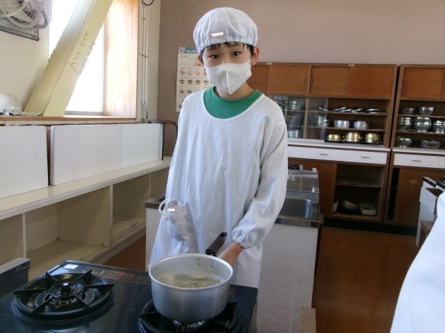 5年1組の家庭科「調理実習」授業の様子です。お味噌汁を作っています。