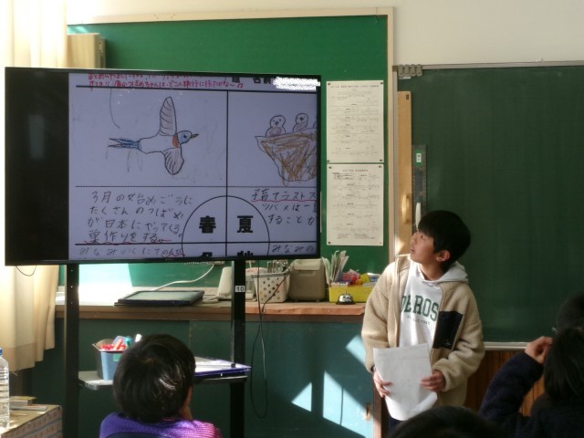 4年1組の理科の授業の様子です。1年間、四季それぞれの生き物を見つけてきました。今日はそのまとめを発表していました。