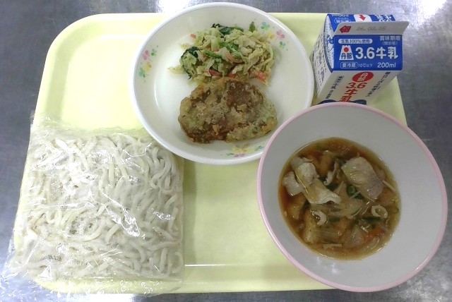 肉うどん(うどん・つゆ) 牛乳 黒はんぺんの磯部揚げ ごま和え