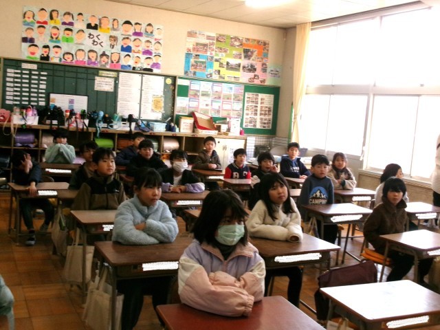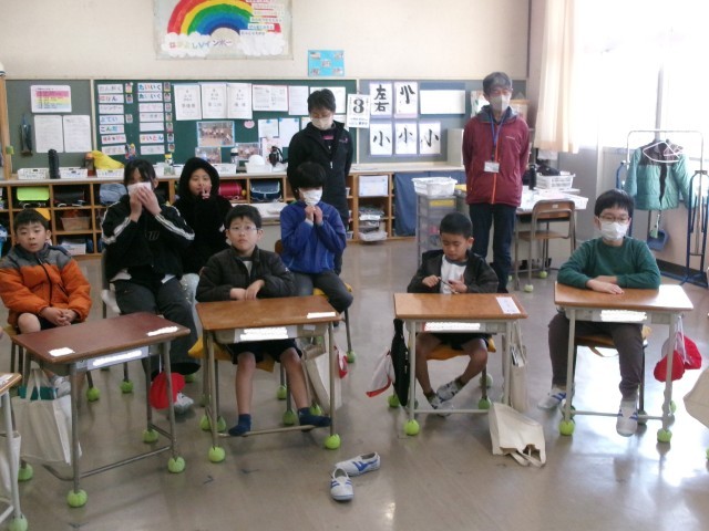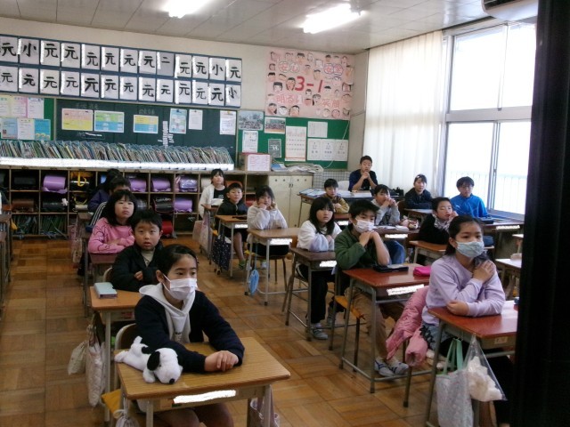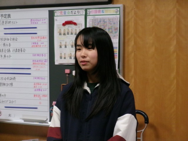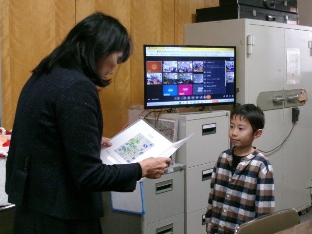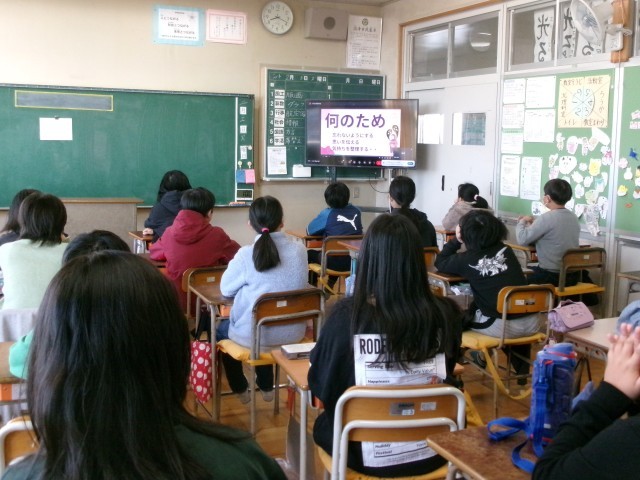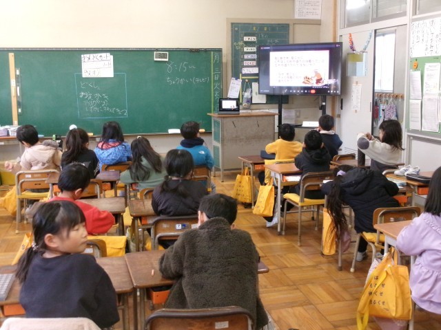 今朝は行われた朝会の様子です。校長先生の話と、運営委員長からあいさつ運動についての話がありました。また、朝会後に日専連全国児童版画コンクールで入賞した児童の表彰がありました。