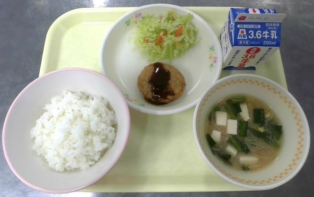 ごはん 牛乳 静岡県産えびいもコロッケ ソース ボイルドキャベツ もやしの坦々スープ