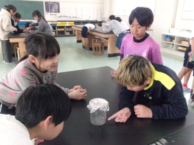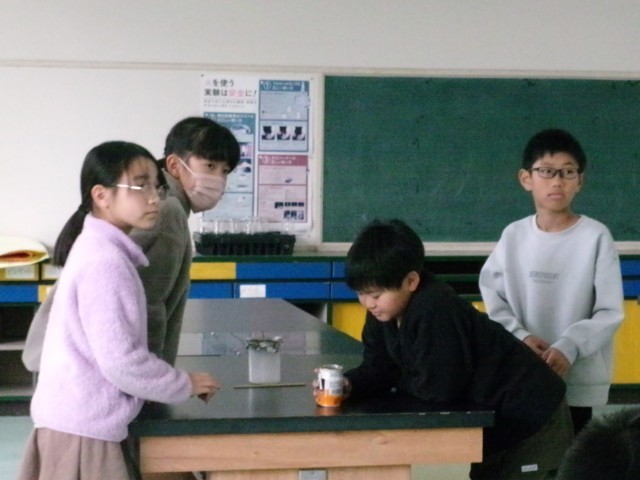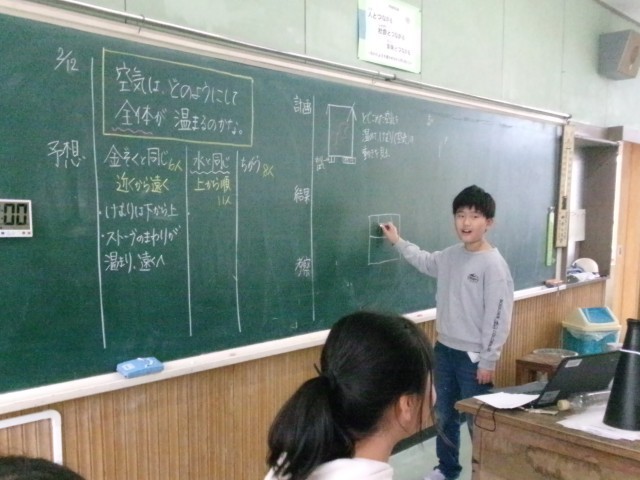 4年2組の理科「ものの温まり方」の様子です。部屋の空気が、どのように温まっていくのか実験を通して考えています。