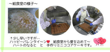「ハートのなると、手作りココアケーキ、季節を感じられる給食うれしいです。」
