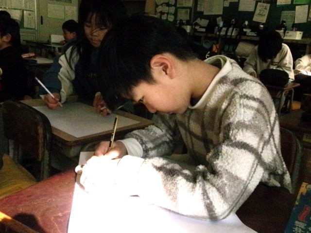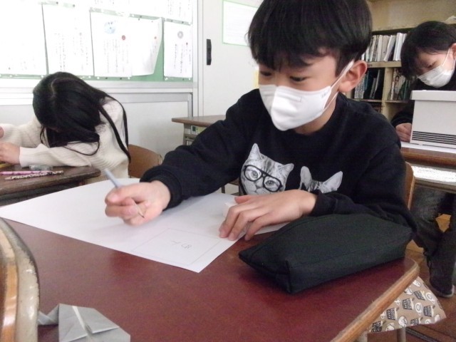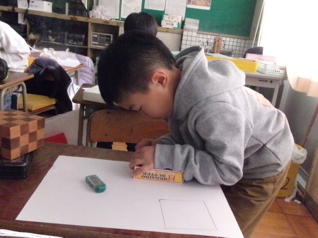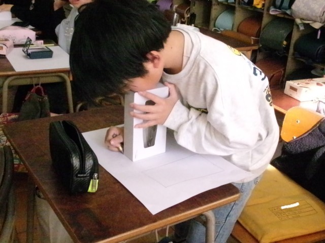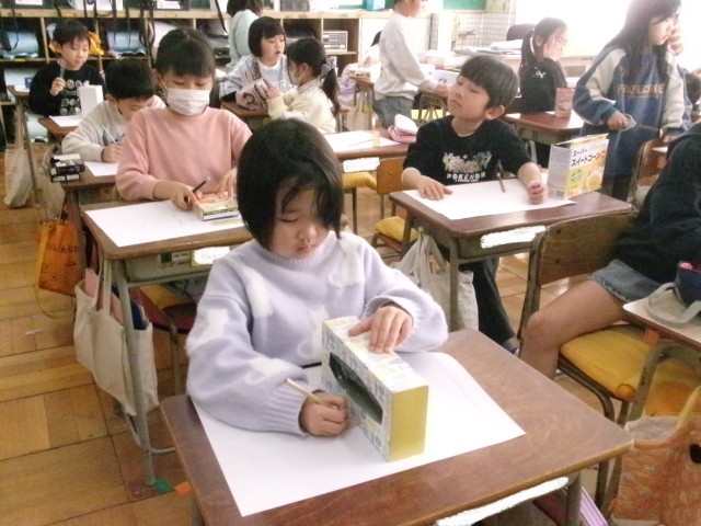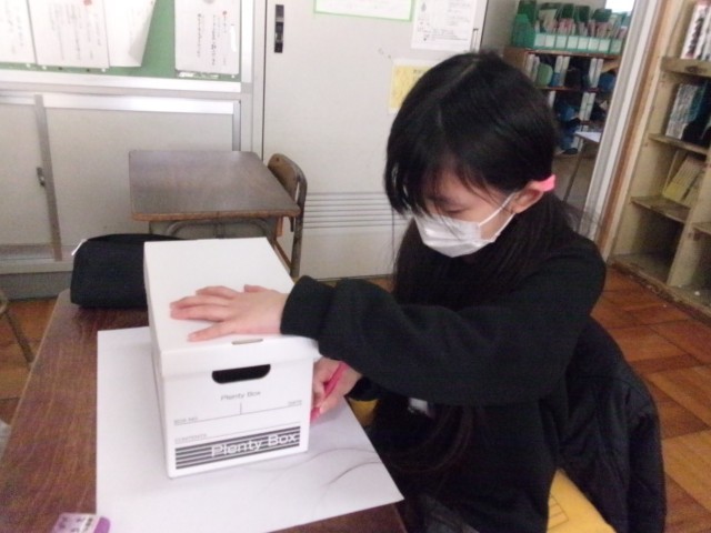 2年2組の算数の授業の様子です。家から持ってきた箱の形を写し取って、面の数を数えています。