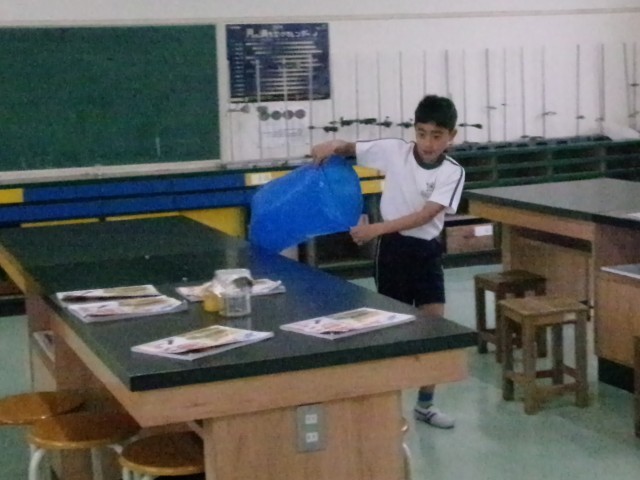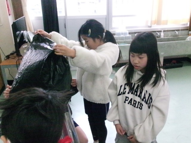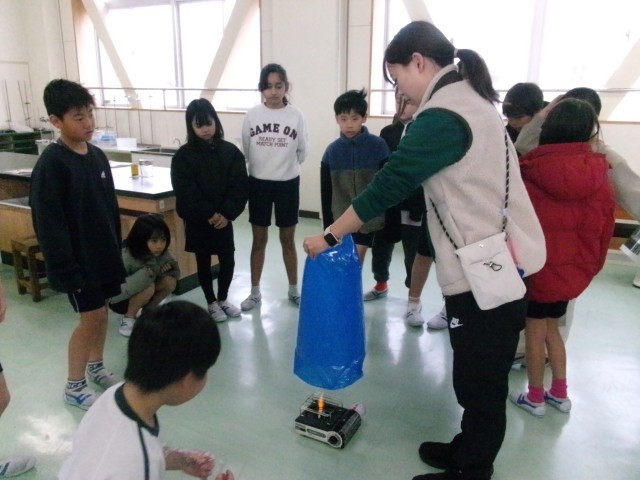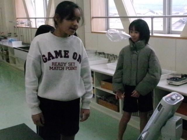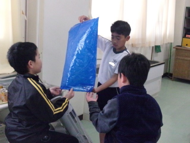 4年1組の理科の授業の様子です。温められた空気が上にいくのか確かめています。