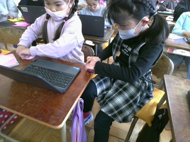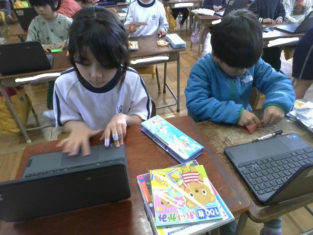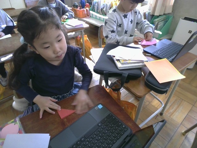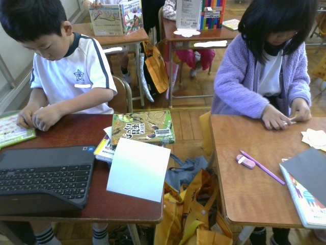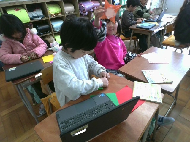 1年生は、お世話になった2,6年生にお礼のプレゼントを折り紙で作りました。友達と楽しそうに作っています。