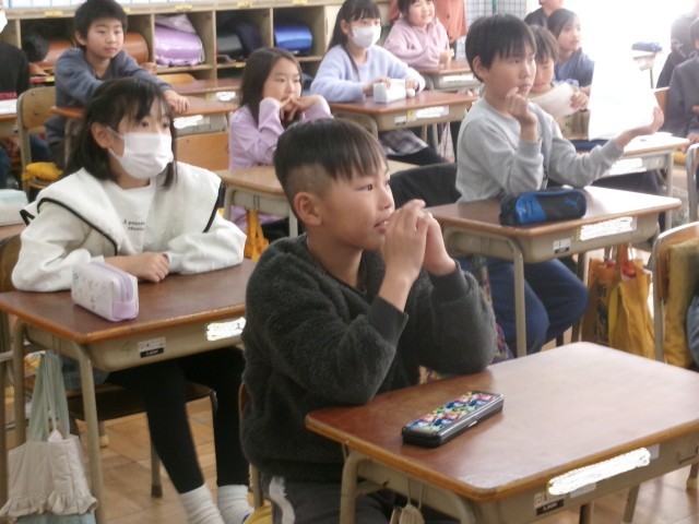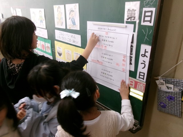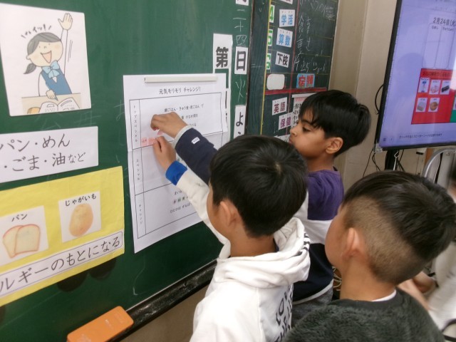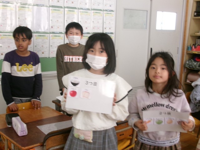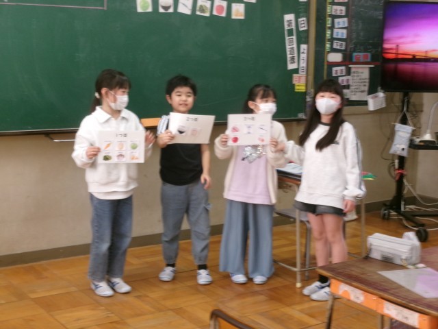 3年2組の学活「食べ物のはたらきを知ろう」の授業の様子です。健康な体を作るためには3つの栄養グループをバランスよく食べるといいことを知りました。