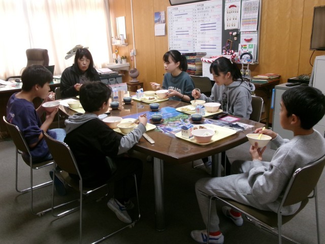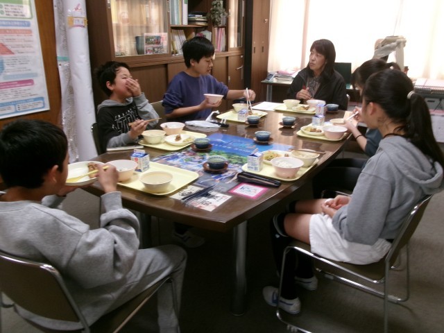 6年2組の校長先生との会食の様子です。今日のグループはいつもより輪をかけてにぎやかで楽しそうでした。