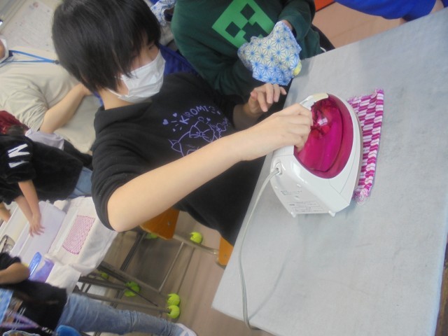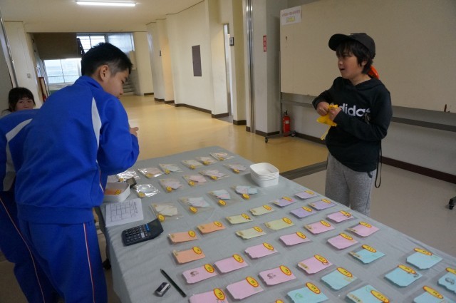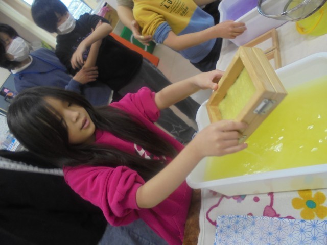 紙すき体験では、中学生が丁寧に教えてくれて、