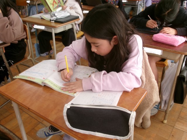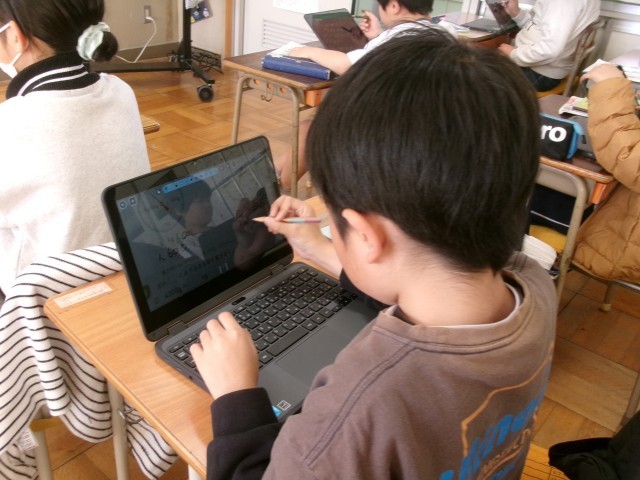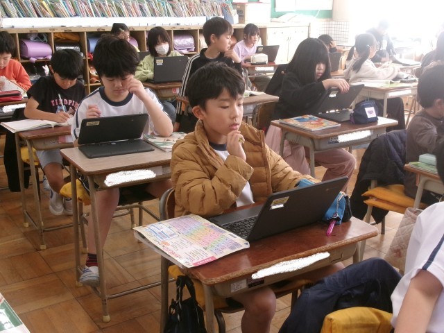 3年1組の算数の授業の様子です。PC上で問題を解く子、ノートに書いて問題を解く子、自分で選んで取り組んでいます。