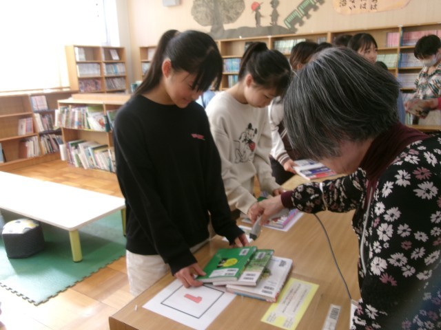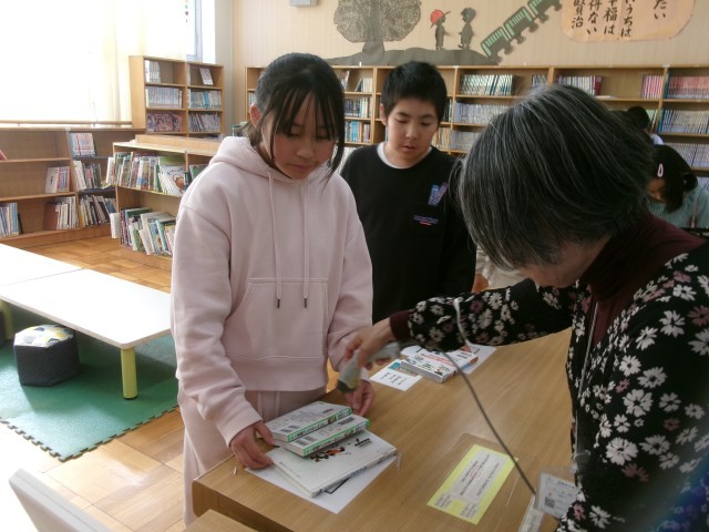 6年2組が学校図書館に本を返却し、新たに本を借りていました。カメラを向けると明るくポーズをとる6年2組です。