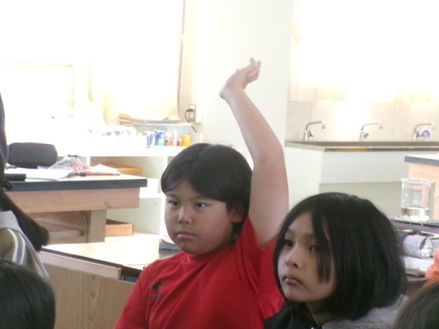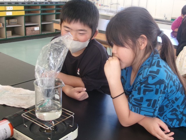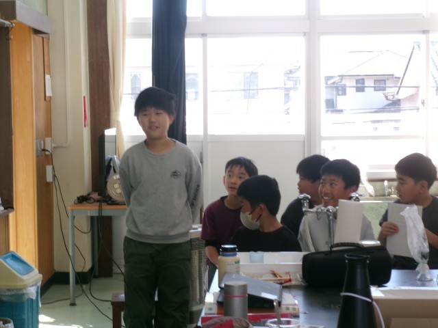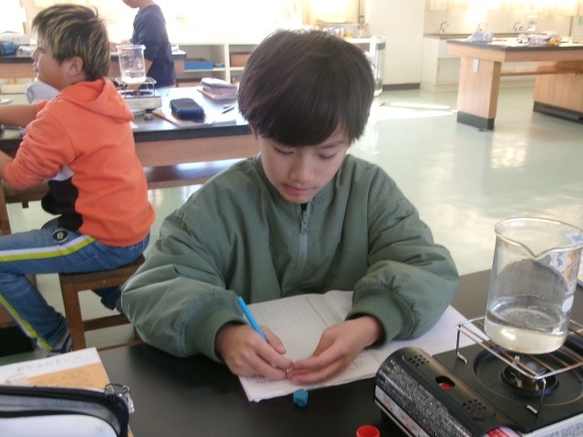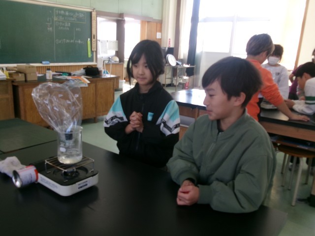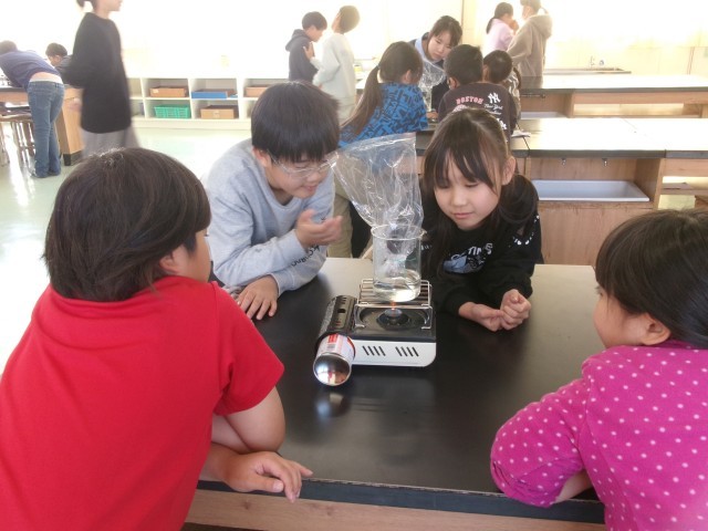 4年2組の理科の授業の様子です。水が沸騰する時に出てくる泡の正体を考えています。