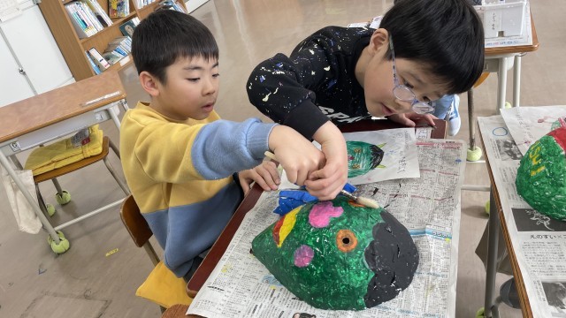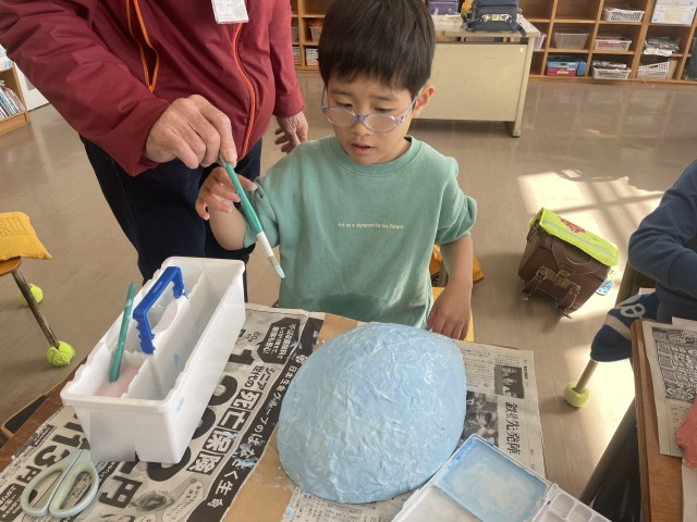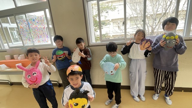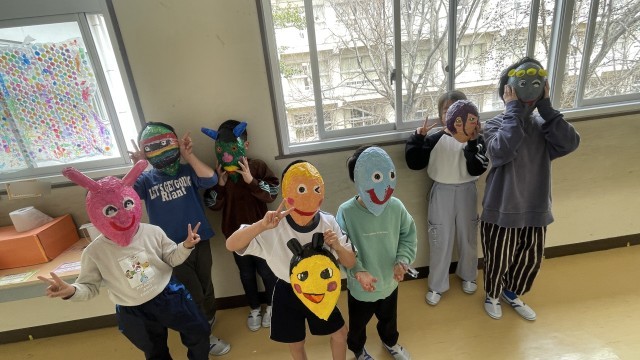 なかよし1組の図工の様子です。風船に新聞紙をはり付け形を作り、ていねいに色をぬりました。完成したおめんで変身!みんなうれしそうでした。