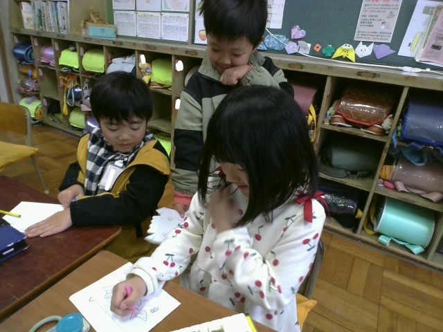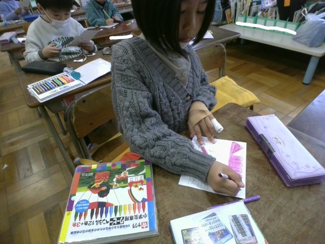 1年生は来年入学する1年生のために、朝顔の種を入れた手紙を作りました。学校のことを紹介して、可愛い柄をかいて仕上げていました。