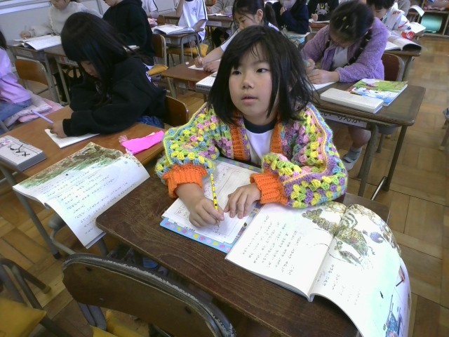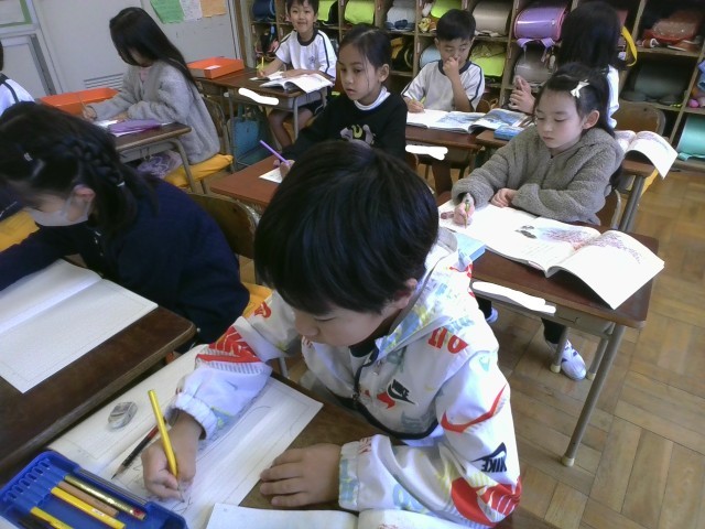 1年生は国語で「スイミー」という物語文を学習しています。赤い魚の仲間たちを守るスイミーの姿から、いろいろなことを考えています。今日は大きな魚を追い出したときに、スイミーたちがどんなことを話していたのかを考えました。