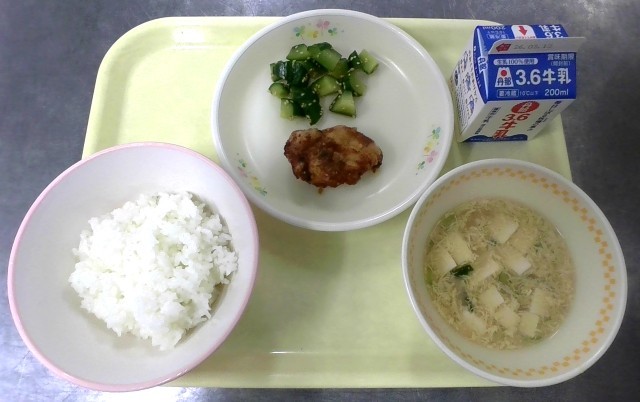 ごはん 牛乳 ユーリンチー きゅうりのカリカリあえ たまごととうふのスープ