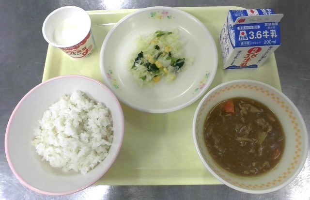 麦入りごはん 牛乳 ポークカレー キャベツとコーンのハニーサラダ ヨーグルト