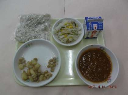 きょうのメニューは、ソフト麺ミートソース、牛乳、ポテトとナッツのから揚げ、ボイルドサラダです。