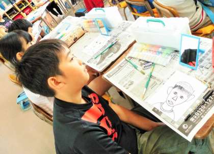 「自分の顔」の作品づくりをやっていました。はじめに色の付け方の説明を先生から聞いてから作業に入ります。どんな作品に仕上がったのでしょうか。