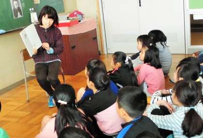 「みんなで本を楽しもう」の学習で、「やまなし(宮沢賢治)」の読み聞かせを聞いている場面です。