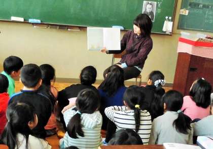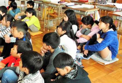 「みんなで本を楽しもう」の学習で、「やまなし(宮沢賢治)」の読み聞かせを聞いている場面です。