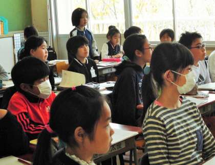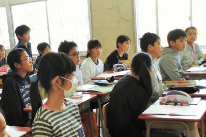 詩「出発」の学習で、作者(井上 靖)の思いが表れている表現について話し合っている場面です。友達の意見につなげて自分の考えを話すことができていました。