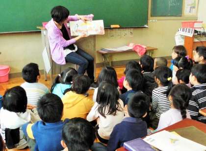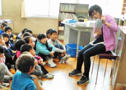 「みんなで本をたのしもう」の学習で、先生から「ランパンパン」の読み聞かせをしてもらっている場面です。物語を楽しみながら読むことが学習のねらいになります。