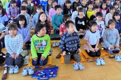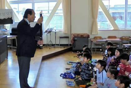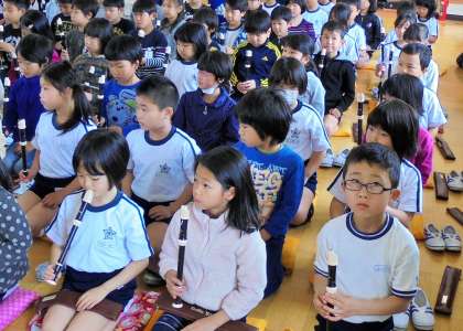 リコーダーの正しい持ち方について学んでいる子供たちです。