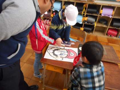 今回は、「福笑い」です。顔の部分や、上下・左右への動かし方の言い方を学習し、「福笑い」を楽しむことができました。