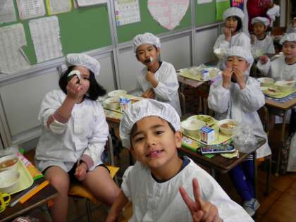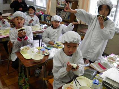 給食記念週間のため、今日の給食は子どもたちが自分でおにぎりを作って食べました。子どもたちは上手におにぎりを作り、とっても楽しく、おいしくいただきました!