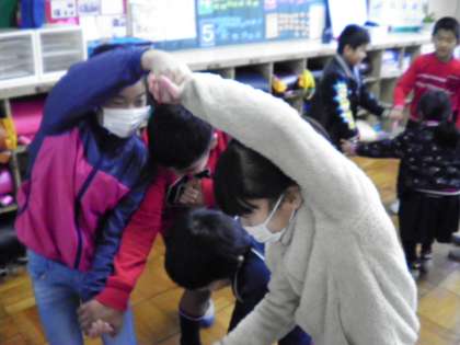 わらべうたを聞いたり、歌ったりしました。「なべなべそこぬけ」では、二人組で歌いながらあそびました。始めは二人組でしたが、人数を増やし、3人組…4人組…6人組と歌ってあそびました。「今度は、クラス全員でやってみたい!」という子どもたちの声があったので、今度は全員で挑戦します☆