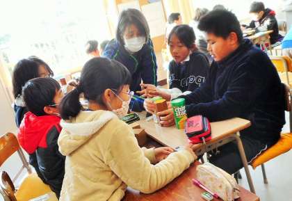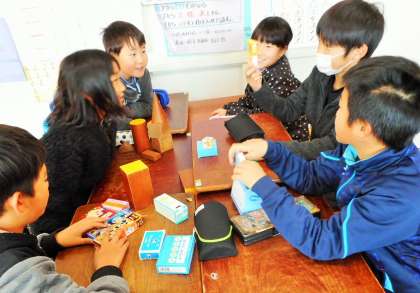 「直方体と立方体」の学習で、身の回りにあるいろいろな箱を、グループで話し合いながら分類していました。箱の「面」に注目して分けているグループが多かったです。