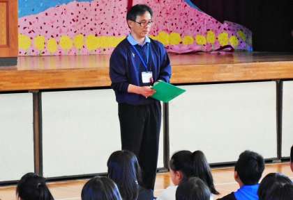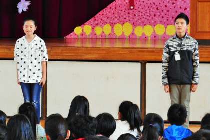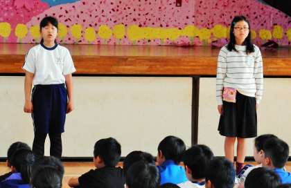 担当の内村先生からの趣旨説明の後、代表の4人の子供から、「交通安全リーダーのてびき」についての話がありました。