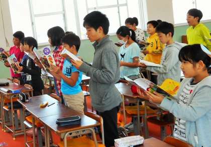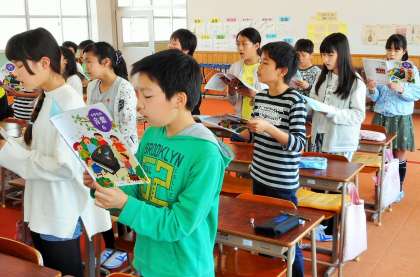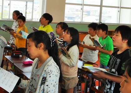 「翼をください」の範唱CDを聴いた後、もう一度練習をしている場面です。きれいな歌声が音楽室に響いていました。