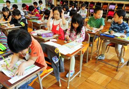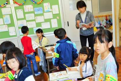 教科書にある問題(数字の「4」を書く練習)をやっていました。できて子は、二人の先生に見てもらいます。