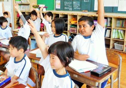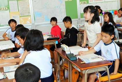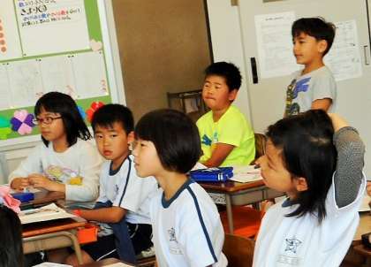 「かけ算」の学習で、3の段の九九を使った計算について話合っていました。写真は、「0×3=0」の理由について意見を発表している場面です。