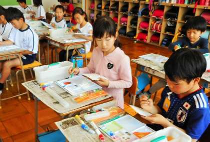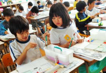 原色(赤・青・黄色・白)を混ぜ合わせてできる色遊びをやっていました。きれいな色ができた子供たちは大喜びでした。