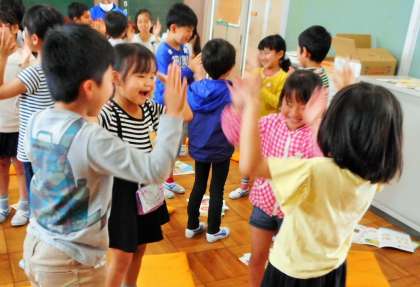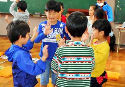 「さんぽ」の曲で歌遊びをしている場面です。ペア→3人組→4人組と人数が増えていきましたが、大喜びの子供たちでした。