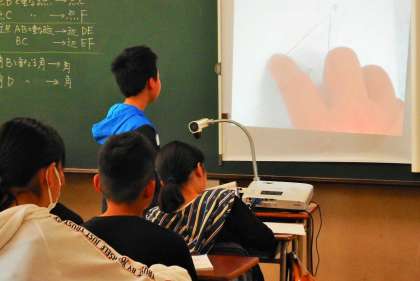 実物投影機を使って、点対称の図形の対応する辺などについて確認をしている場面です。線対称の図形より難易度が高くなります。