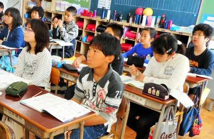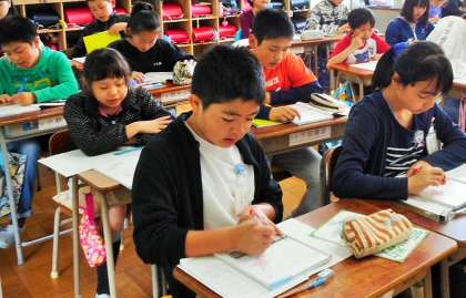 実物投影機を使って、点対称の図形の対応する辺などについて確認をしている場面です。線対称の図形より難易度が高くなります。